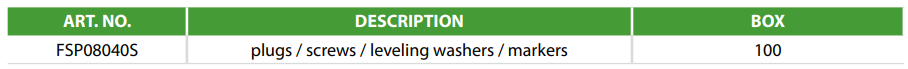 - The set includes: plug, screws, levelling washers, carpentry markers