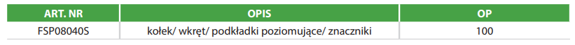 • Zestaw zawiera: kołki rozporowe, wkręty, podkładki poziomujące, znaczniki stolarskie.