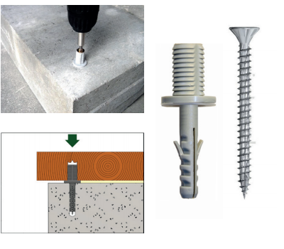 Kołki rozporowe FSP umożliwiają solidne i NIEWIDOCZNE zamocowanie drewnianych stopni schodowych do podłoży z betonu i profili stalowych.